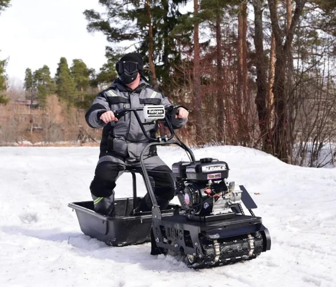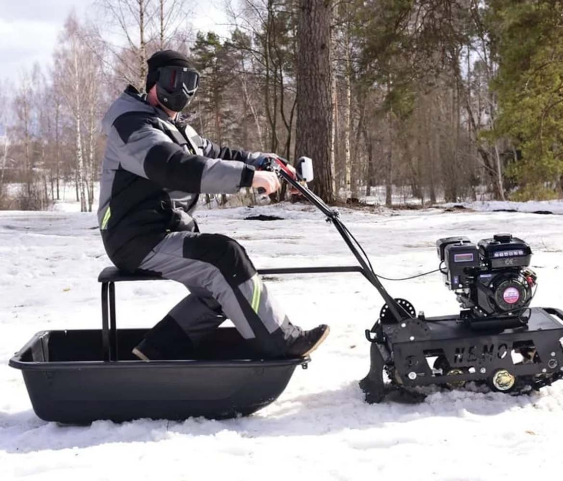 Купить мотобуксировщик БУРЛАК-М НЕМО 6.5 л.с. стоит тем, кому нужен бюджетный компактный агрегат. Это самая облегченная модель от Бурлак-М: длина составляет всего 77 см, вес — 60 кг. По сути это пластиковые сани с сиденьем и рулевым блоком. Конструкция полностью разбирается, что полезно при транспортировке в автобагажнике и хранении агрегата.