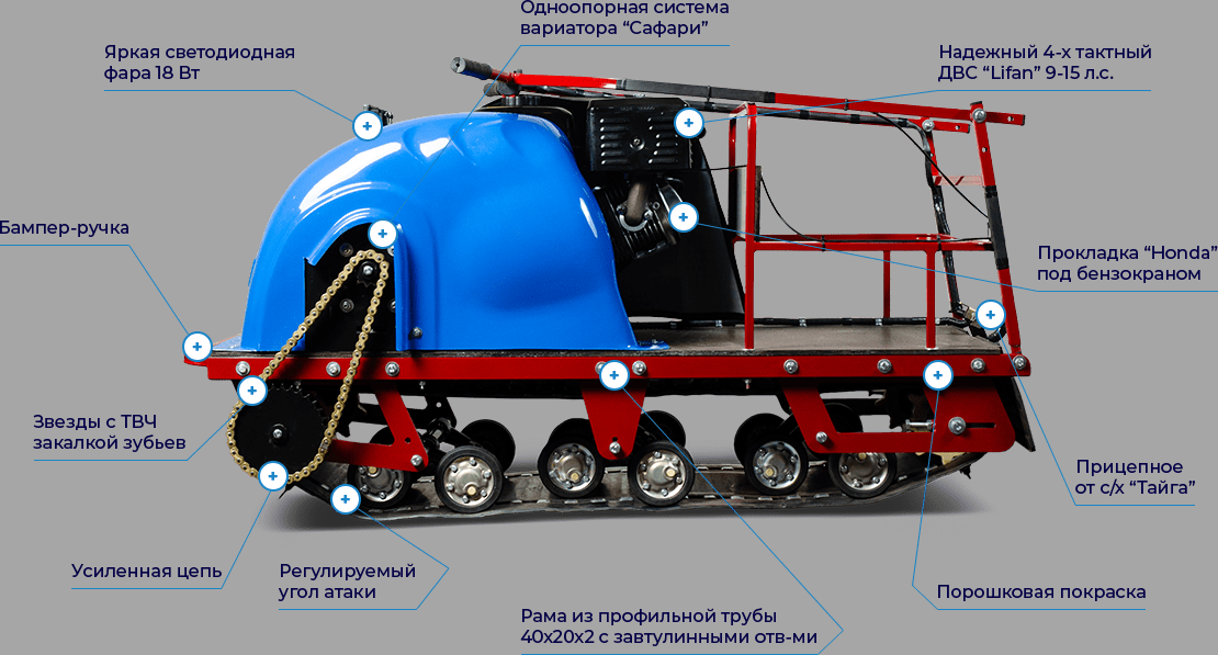 - Агрегат оснащен карбюратором и катковой подпружиненной подвеской, что обеспечивает плавное движение и устойчивость на любой поверхности.