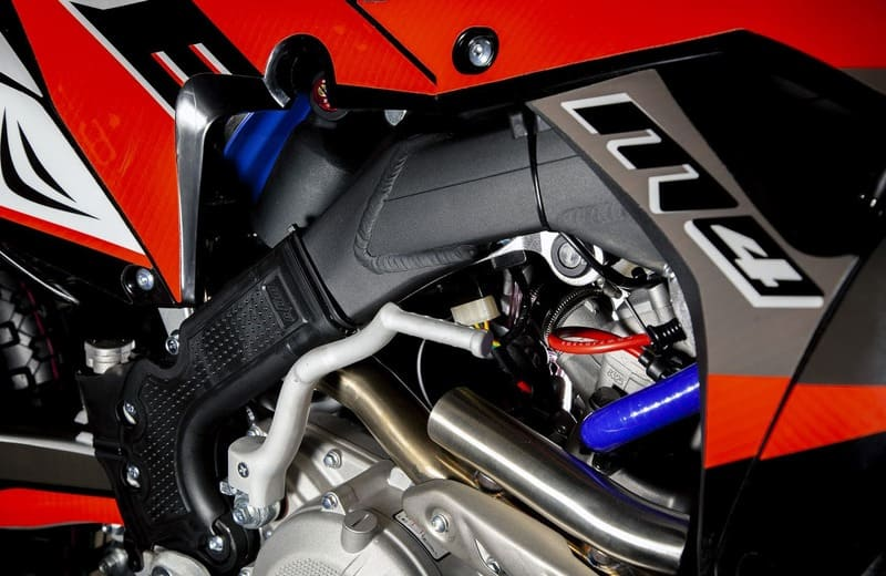M4 уже в заводской комплектации готов к покорению серьезного бездорожья и участия в соревнованиях. Подвеска MOJO c большими ходами имеет полный диапазон регулировок и помогает отрабатывать даже самые жесткие приземления, с лёгкостью "проглатывает" все неровности. Установлена вилка “перевертыш” Mojo Racing c “толстыми” перьями диаметром 57 мм с двумя картриджами. Идеальная развесовка и сбалансированность конструкции мотоцикла даёт преимущество при прохождении острых поворотов и подъёмов.