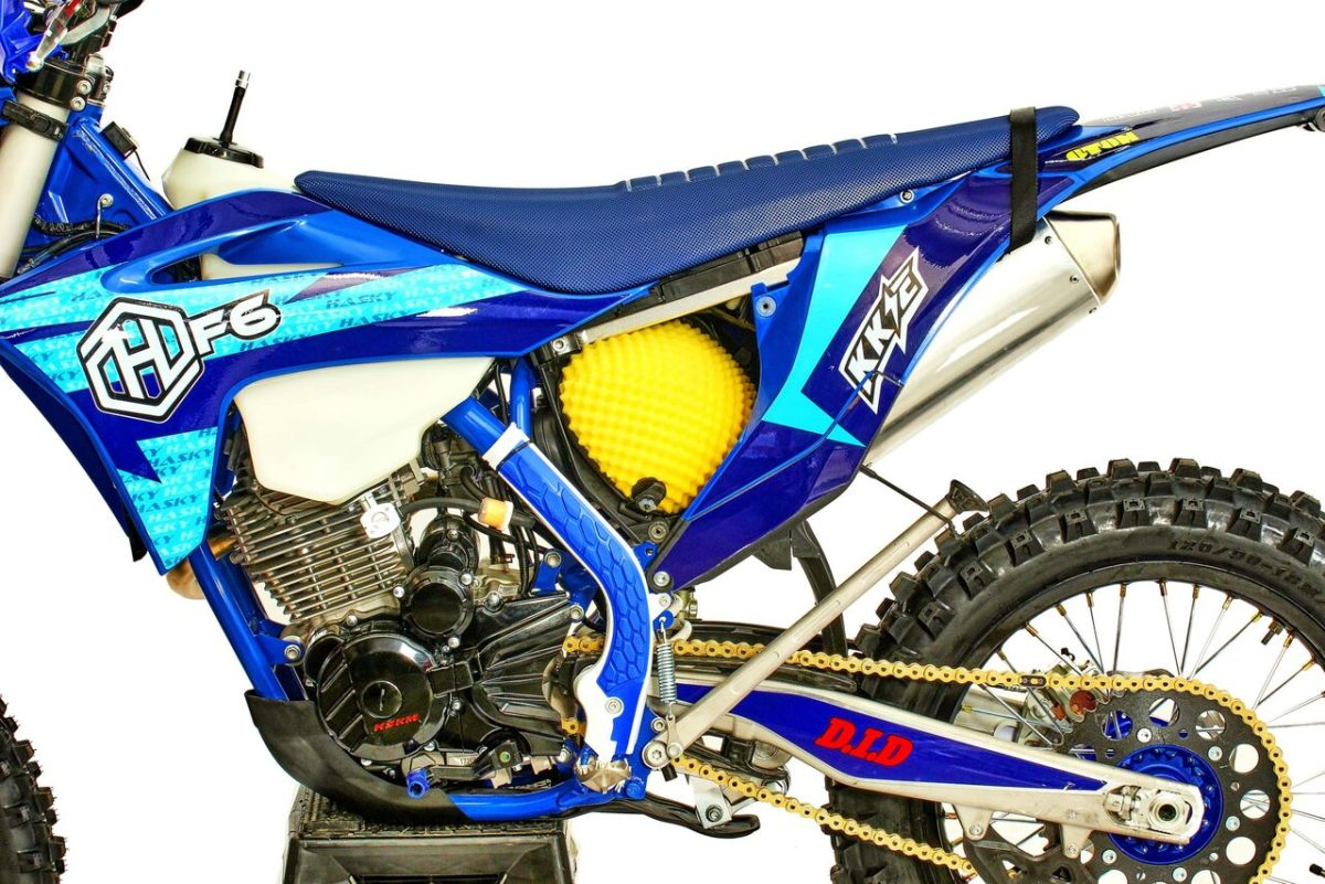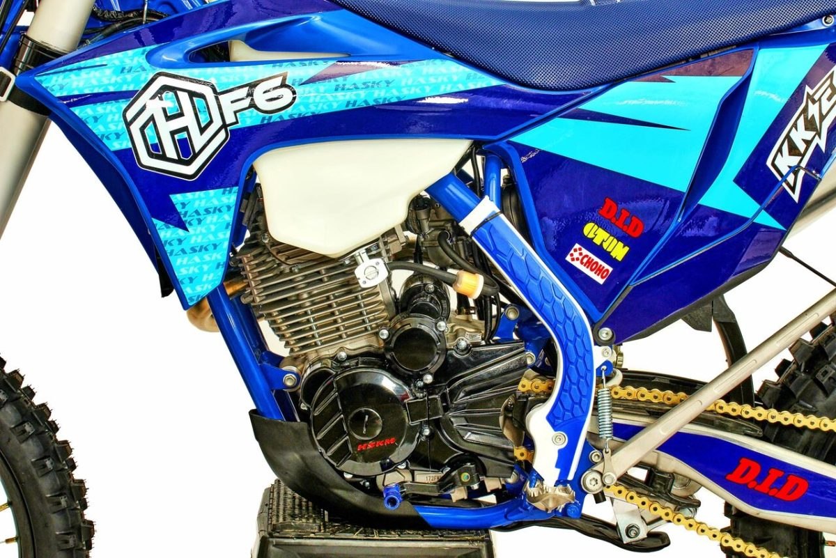 Мотоцикл Hasky F6 — полноразмерный мотоцикл с двигателем 172 FMM и увеличенной поршневой на 74мм. Максимально продуманное соотношение ресурса, мощности и комплектации. Идеально подходит для гражданского эндуро. Ходы подвесок позволяют ехать любые бревна, а 120 задняя покрышка обеспечит зацеп на любом покрытие. В заводской комплектации есть стропы, руль рентал, моточасы и приборная панель.