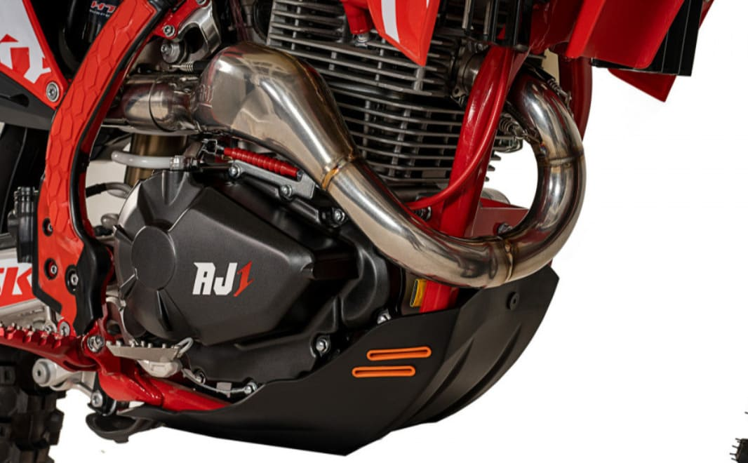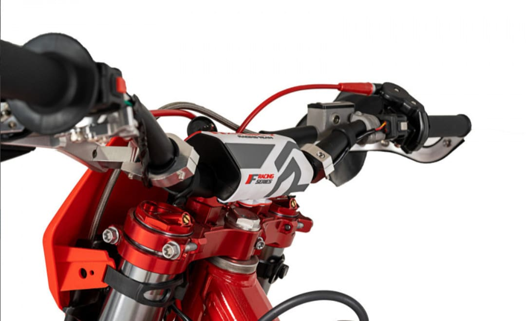 Траверсы CNC AJ1 новой конструкции двойного охвата вилки, для равномерного распределения нагрузки на передние амортизаторы компании HTW. А усиленный руль из сплава 7075 в паре с армированной защитой рук имеет возможность быть отрегулированным на траверсах с положением по горизонтали для настройки самой комфортной посадки. А чтобы закрыть вопрос комфорта окончательно, на мотоцикле установлены пеги (подножки) AJ1, которые имеют широкую форму, смещение назад и исключает налипание на них грязи.