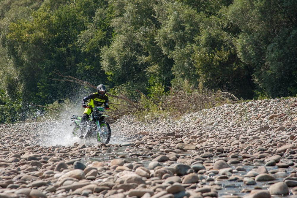 Подвеску можно настроить под грязь, камни и песок без потери качества. В конструкции задней подвески расположена прогрессия, позволяющая с комфортом передвигаться по мелкой щебёнке и преодолевать прыжки без ущерба для амортизатора. Байк легко настроить под свой вес, подобрав идеальный баланс жёсткости.