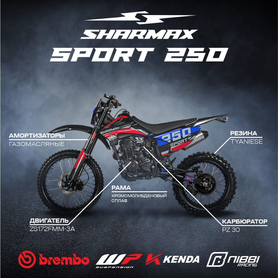 Устойчивый и надёжный, Sharmax Sport 250 станет идеальным спутником для тех, кто начинает своё путешествие в мир эндуро. Облегчённая рама из высокопрочной стали не боится перегрузок, а амортизаторы можно настроить под любой тип поверхности. Надёжный двигатель, сбалансированная подвеска и “злой” рисунок резины делают конструкцию байка идеальной для внедорожных гонок. Sharmax Sport 250 готов помочь не только новичкам, но и опытным райдерам. Вам остаётся лишь проверить его в деле.