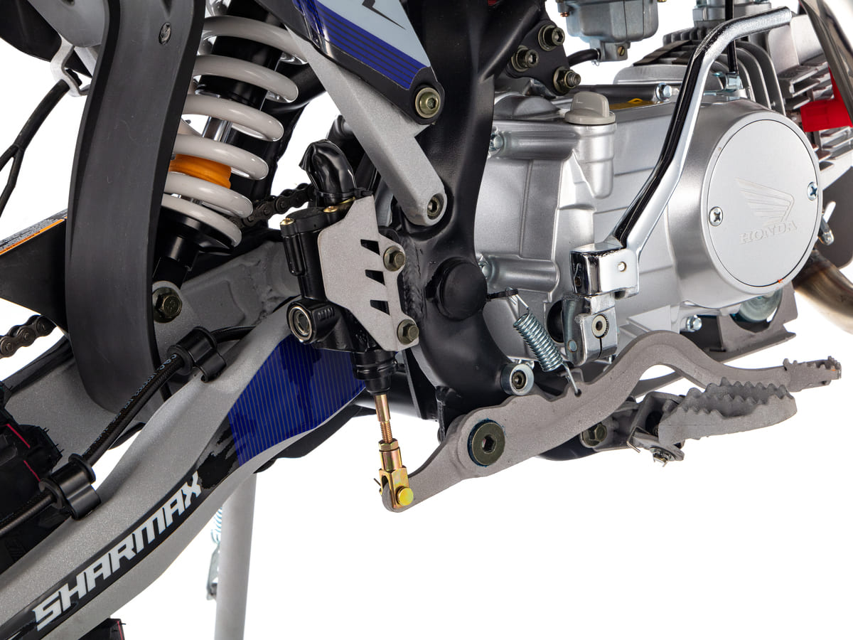 Подвеска Sharmax Motors Power Max 145 готова к большим перегрузкам. Грязь, камни и песок — этот байк справится с любыми препятствиями. Передняя вилка перевёрнутого типа обеспечивает максимальное сопротивление изгибу амортизатора на виражах. Идеально для гонок по бездорожью.