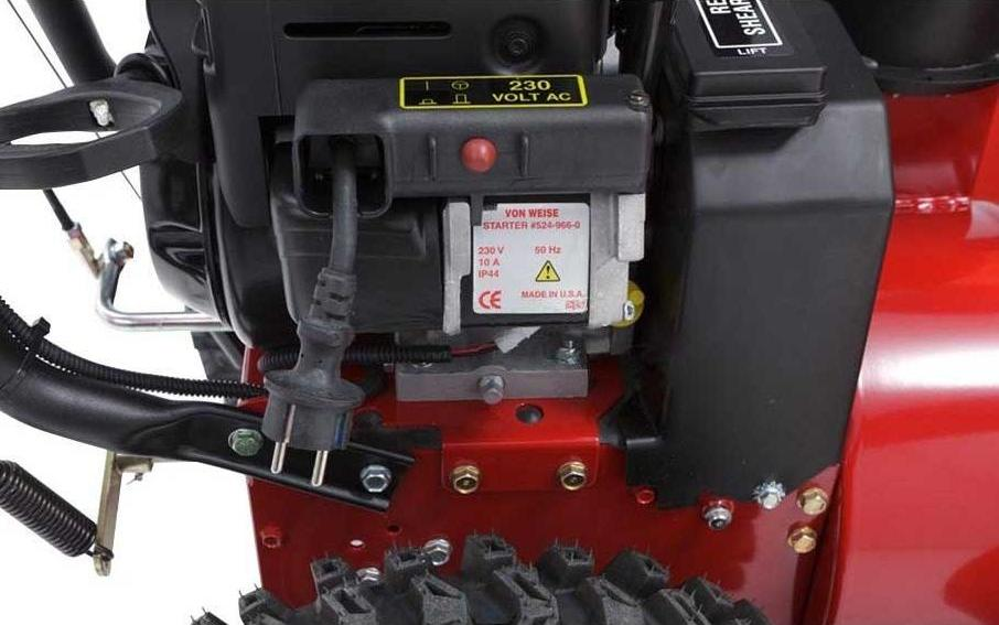 - Двигатель. Мощность техники обусловлена встроенным брендовым Briggs&Stratton 1150 Serries (8 л.с.). Устройство функционирует в мороз, т.к. относится к зимнему оборудованию. Заводится от сети (электрическим стартером на 220 В) и вручную.