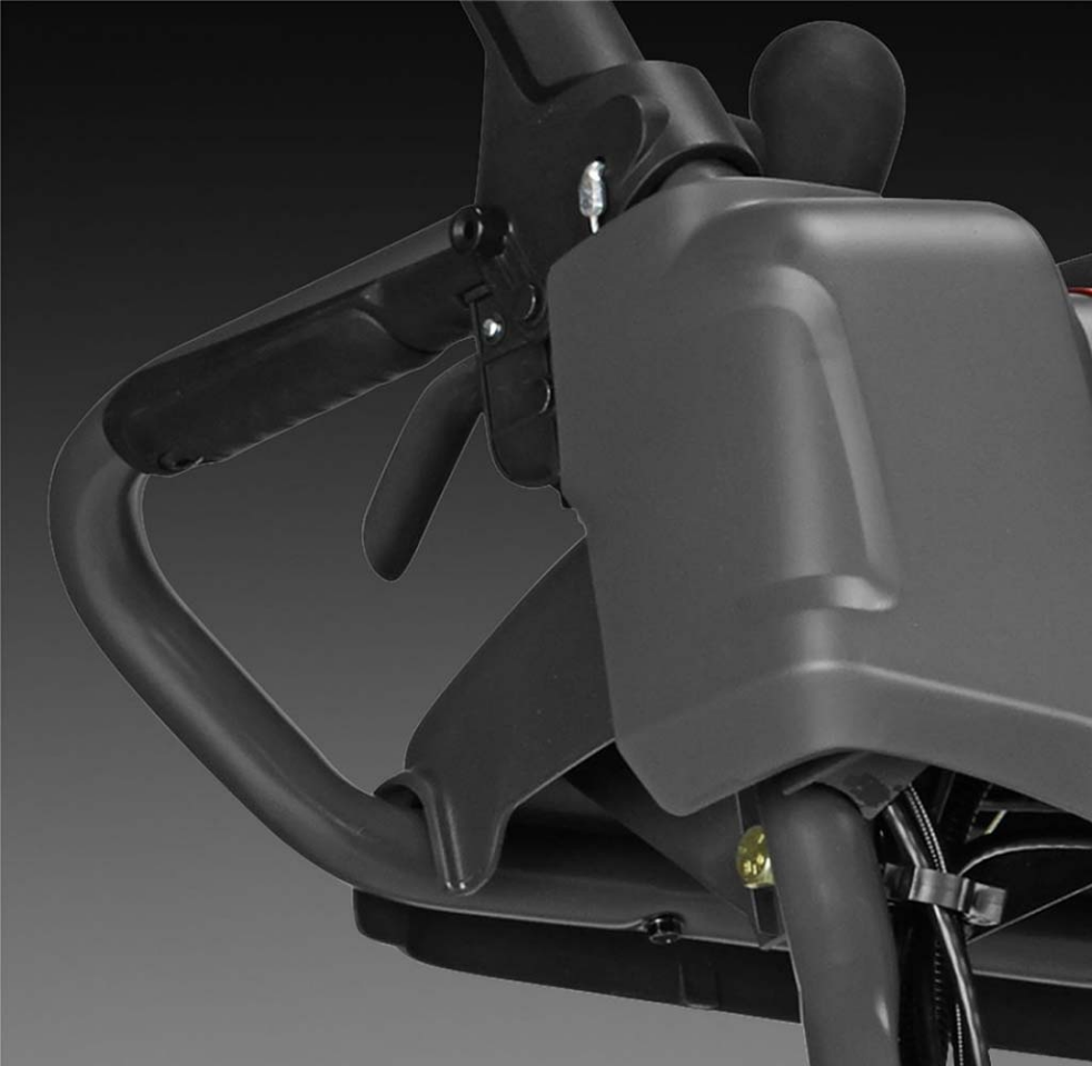 - Управление выбросом снега. Направление выброса снега раструбом регулируется при помощи рычага на панели оператора.
