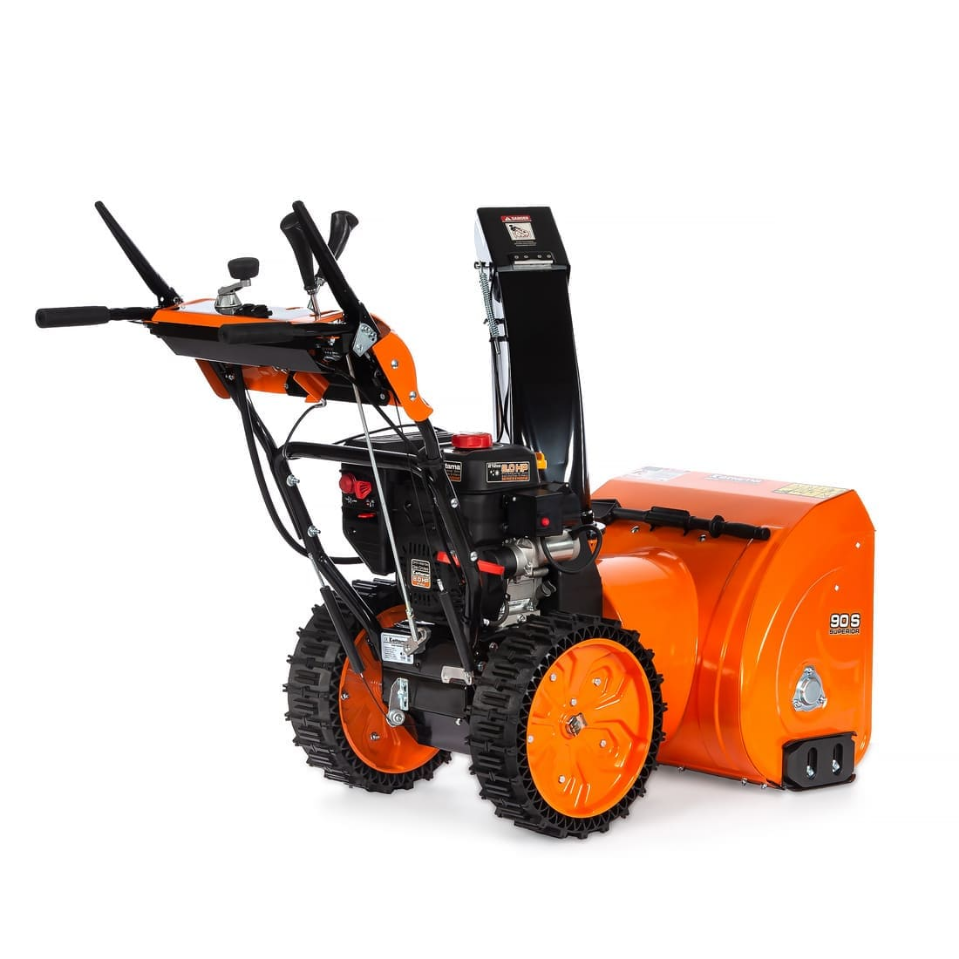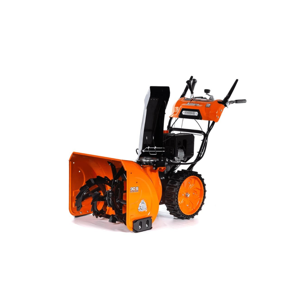 Возможность эффективно перерабатывать снег практически любого типа сложности связана с конструкторским решением сочетания высокой мощности (8,5 л.с.), небольшой ширины уборки (663 мм) и усиленным сцеплением 14-дюймовых безвоздушных шин Runflat. Небольшая ширина ковша, даёт возможность эксплуатировать эту технику на любом приусадебном участке с узкими дорожками. Повышенная высота уборки (540 мм) по сравнению с моделью 80S (510 мм) позволяет применять эту технику при работе с более высоким снегом. Однако это же создаёт определенные ограничения в работе с лежалым снегом с элементами сухого фирна. Рекомендуемый тип снега для 90S для эффективной уборки не должен превышать плотность 400 кг/м3. Дефлектор из усиленного металла позволяет менять направление выброса снега на 190 градусов при помощи рукоятки на корпусе машины. Стальной агрессивный шнек с добавлением хромомолибденового сплава позволяет эффективно справляться даже со слежавшимся снегом.